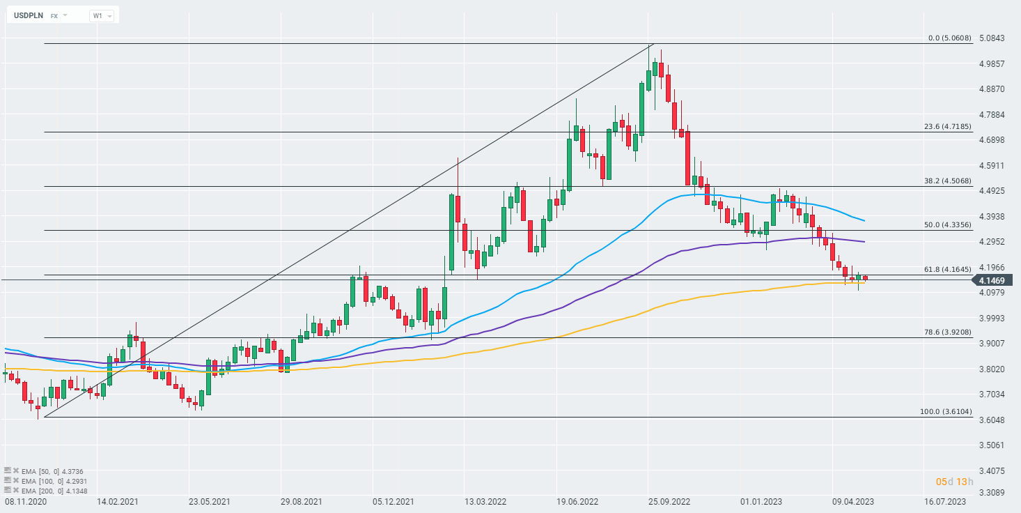 Z perspektywy analizy technicznej para walutowa USDPLN znajduje się w chwili obecnej w kluczowej strefie wsparcia wyznaczonej przez 200- tygodniową, wykładniczą średnią kroczącą oraz zniesienie 61,8% Fibo fali wzrostowej zapoczątkowanej w 2020 roku, Źródło: xStation 5