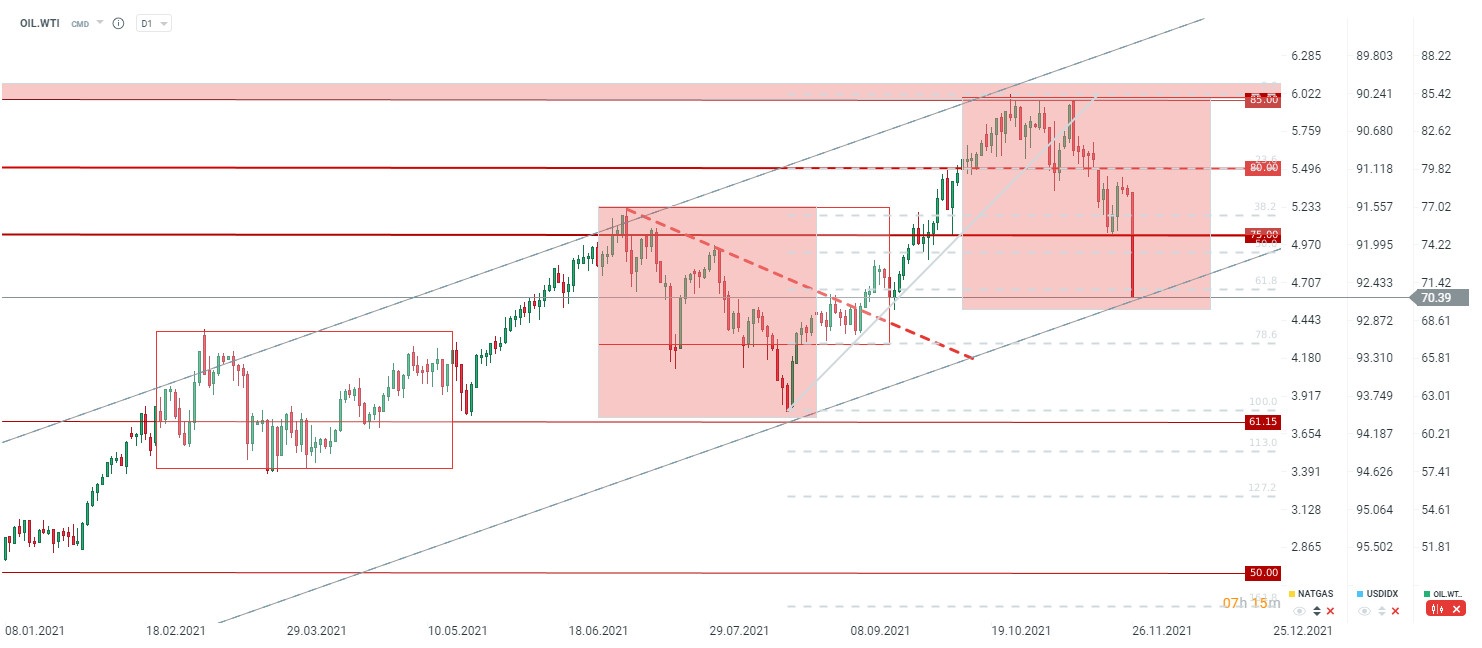 Nowe potencjalne restrykcje, a przede wszystkim potencjalne ograniczenie mobilności prowadzi do silnej wyprzedaży ropy. Istnieje szansa, że wiele krajów zakaże lotów do i z krajów, gdzie występuje nowy szczep wirusa. To może bardzo mocno ograniczyć popyt na ropę. Co więcej, USA oraz inne kraje zdecydowały się ostatnio na uwolnienie rezerw strategicznych, co zwiększa potencjalną nadwyżkę na rynku ropy w ostatnim miesiącu tego roku.