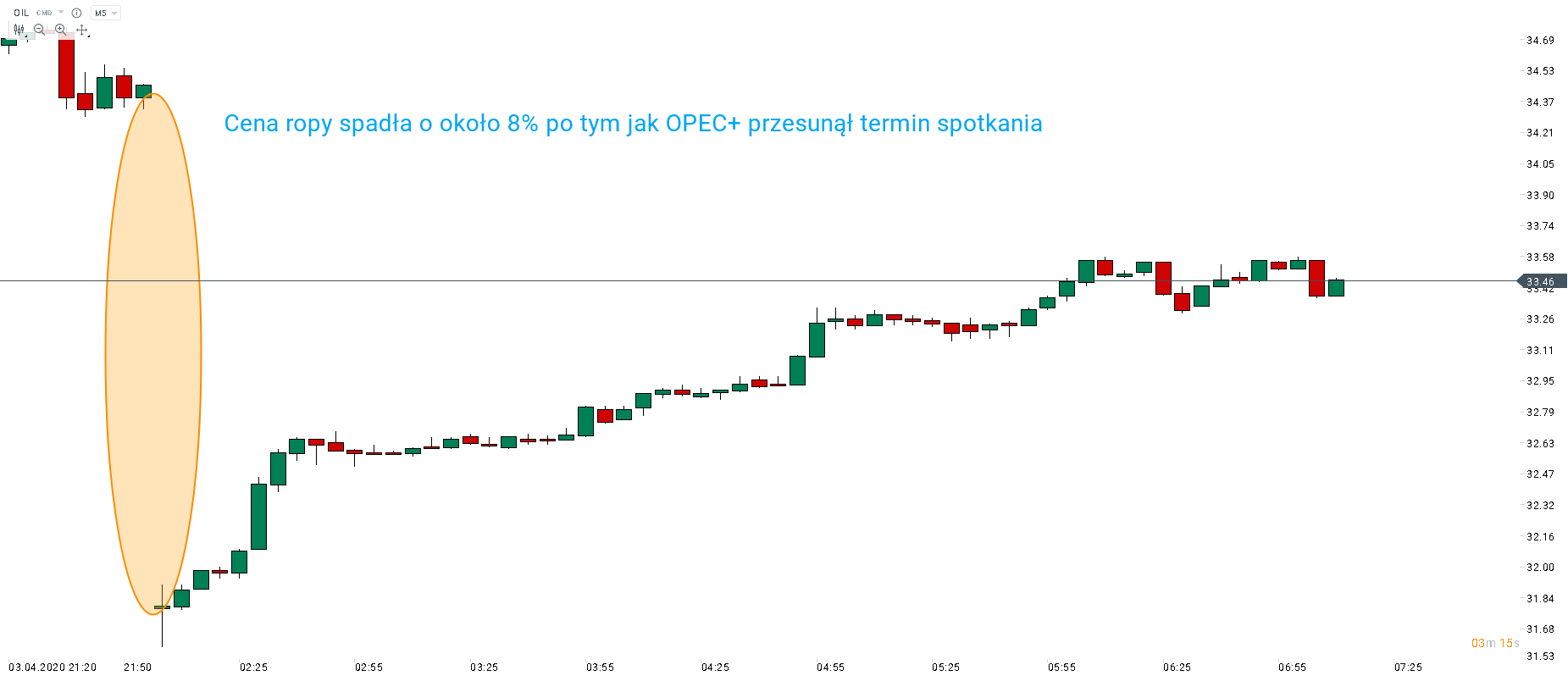Cena ropy bardzo mocno spadła po tym jak grupa OPEC+ przełożyła spotkanie. "Czarne złoto" odrobiło już ponad połowę strat. Źródło: xStation5