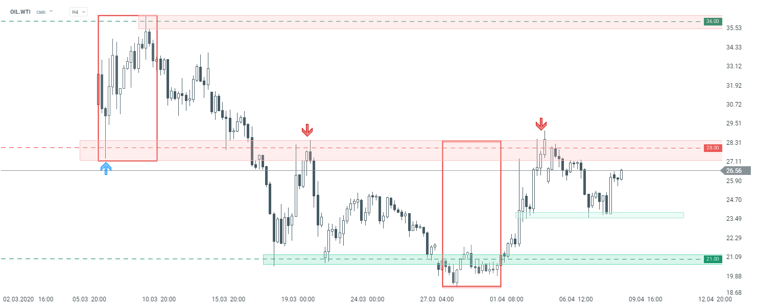 Notowania OIL.WTI ponownie zbliżają się do strefy oporowej przy 28$ za baryłkę. Lokalnym wsparciem pozostają wczorajsze minima przy 23,7$. Źródło: xStation5