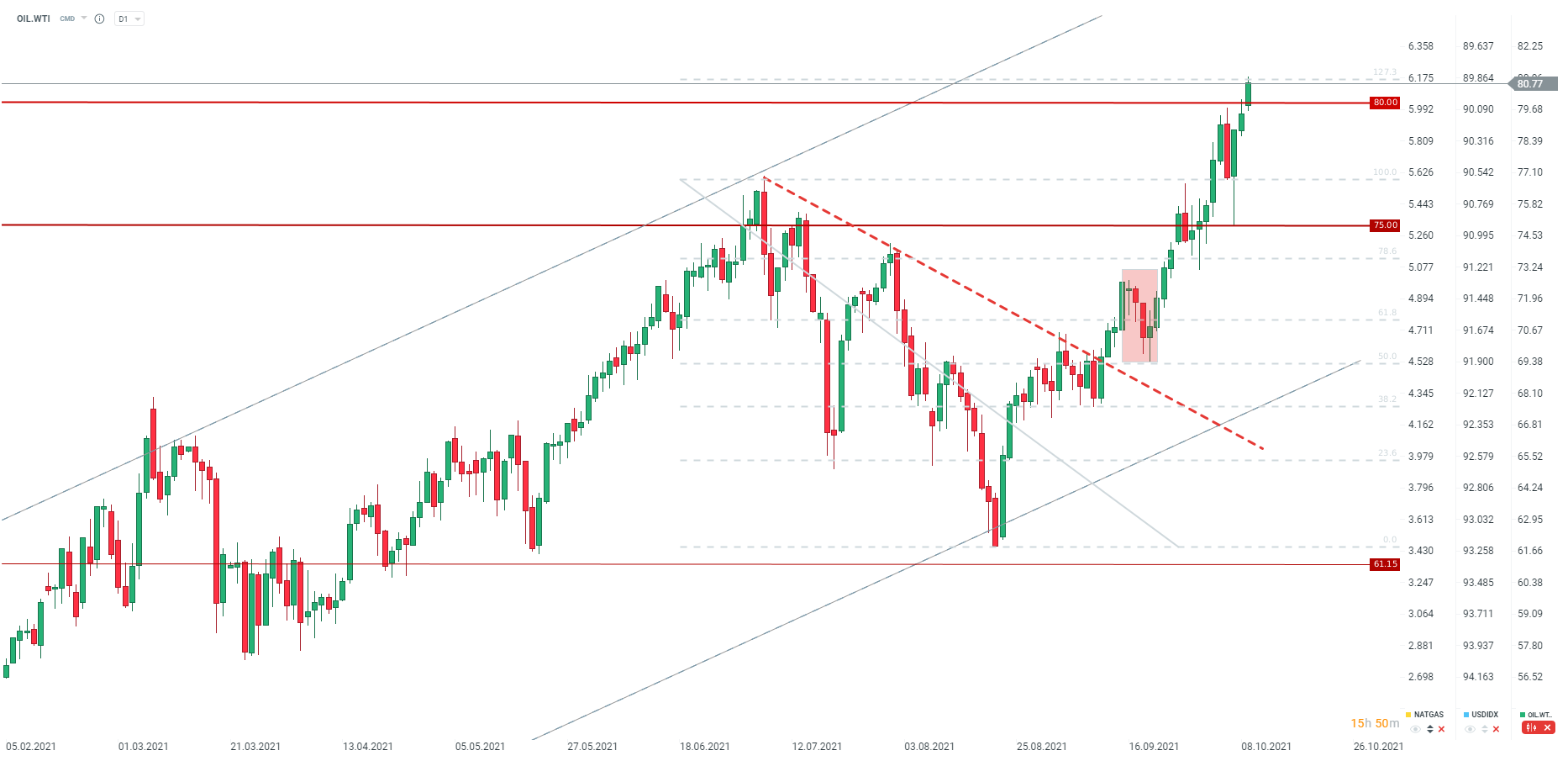 Ropa WTI pnie się na nowe wieloletnie szczyty. Poziom 80 dolarów za baryłkę został pokonany pierwszy raz od 2014 roku! Powód jest jeden - kryzys energetyczny na świecie przy ograniczonej podaży surowców. Na świecie pojawiają się przede wszystkim informacje dotyczące braku gazu - Chiny, Libia czy nawet Niemcy (poziom wypełnienia jest relatywnie niski, ale nie krytycznie niski, całej UE nie jest fatalnie).