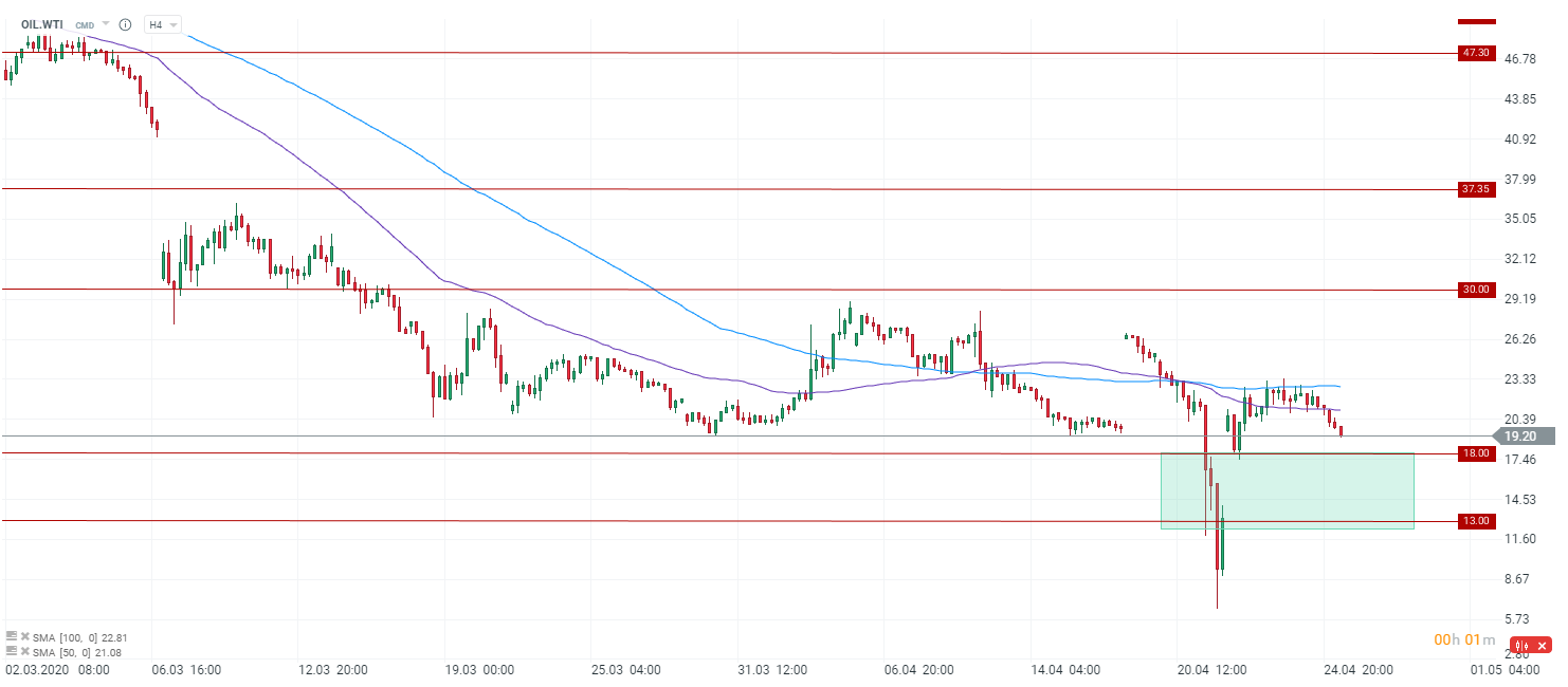 Brak jest nowych konkretnych informacji na temat bieżącej sytuacji fundamentalnej oraz naftowej. Chiny opublikowały dane dotyczące przewozów oraz popytu na poszczególne produkty w poprzednim miesiącu. Okazuje się, że popyt mocno spadł na takie produkty jak benzyna czy kerozyna za marzec (spadek 27% r/r oraz odpowiednio 44% r/r). Oznacza to, że państwo, które przynajmniej miesiąc wcześniej poradziło sobie z problemem koronawirusa, wciąż prezentuje bardzo słabe dane dotyczące popytu. To oznacza, że popyt utrzyma się na niskim poziomie w krajach europejskich oraz w USA przez dłuższy czas.