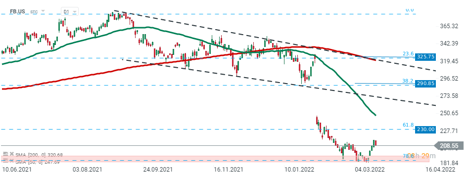 Akcje Meta (FB.US) spadły podczas dzisiejszej sesji o prawie 4,0%. Jeśli obecny sentyment się utrzyma, ruch spadkowy może skierować się w stronę ostatnich minimów na poziomie 190,00 USD. Źródło: xStation5