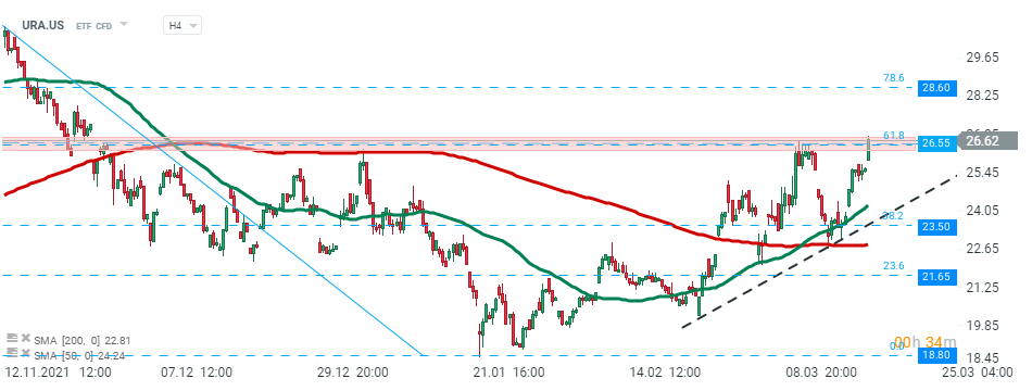 Kurs Global X-URANIUM ETF CFD (URA.US) gwałtownie wzrósł podczas dzisiejszej sesji, jednak kupującym trudno jest przebić się powyżej głównego oporu na poziomie 26,55 USD, który wyznacza poprzednie reakcje cenowe oraz zniesienie 61,8% Fibonacciego ostatniej korekty spadkowej. Źródło: xStation5