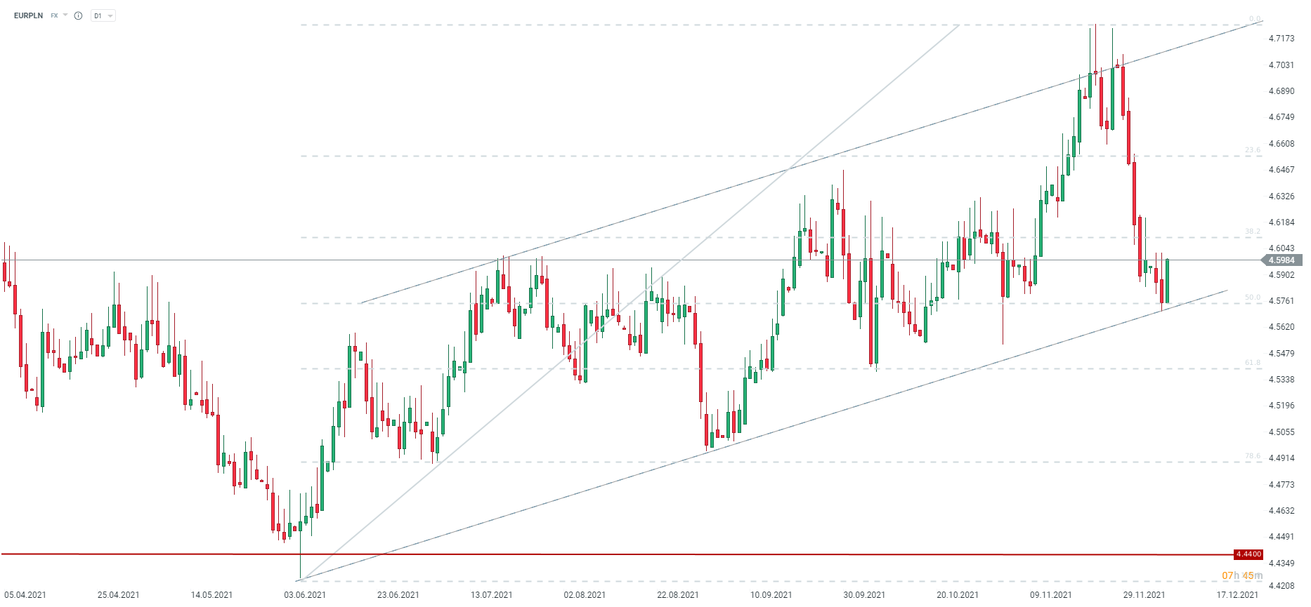 EURPLN rośnie do dziennych szczytów, choć ruchy i tak nie są zbyt duże. Dzisiaj obserwujemy odbicie od kluczowego poziomu wsparcia na zniesieniu 50.0, tuż przy dolnym ograniczeniu wzrostowego kanału. Ważny opór dla pary to okolice 4,6 przy zniesieniu 38.2. Rynek może czuć się nieco rozczarowany, choć można podejrzewać, że może to nie być ostatnia podwyżka. Źródło: xStation5