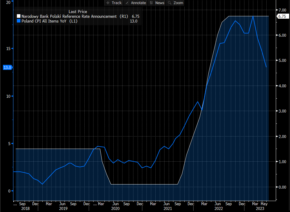 Stopy bez zmian, zgodnie z oczekiwaniami. W komunikacie raczej nie przeczytamy nic nowego, aczkolwiek nie można wykluczyć zadowolenia z niższej inflacji w trakcie konferencji prasowej, która odbędzie się jutro. Źródło: Bloomberg