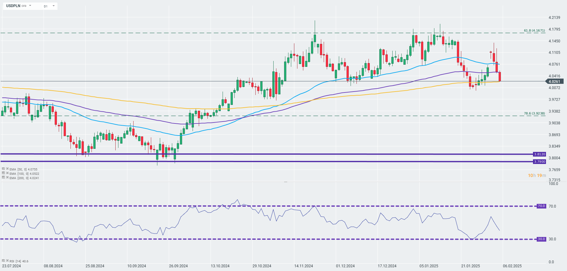 Zgodnie z prognozami, RPP nie zmieniła stóp procentowych w Polsce. Główna stopa pozostaje na poziomie 5.75%. Para USDPLN przedłuża dzisiaj falę spadkową do poziomu 4.0260. Inwestorzy czekają teraz na konferencję z udziałem Prezesa Glapińskiego, która odbędzie się jutro.
