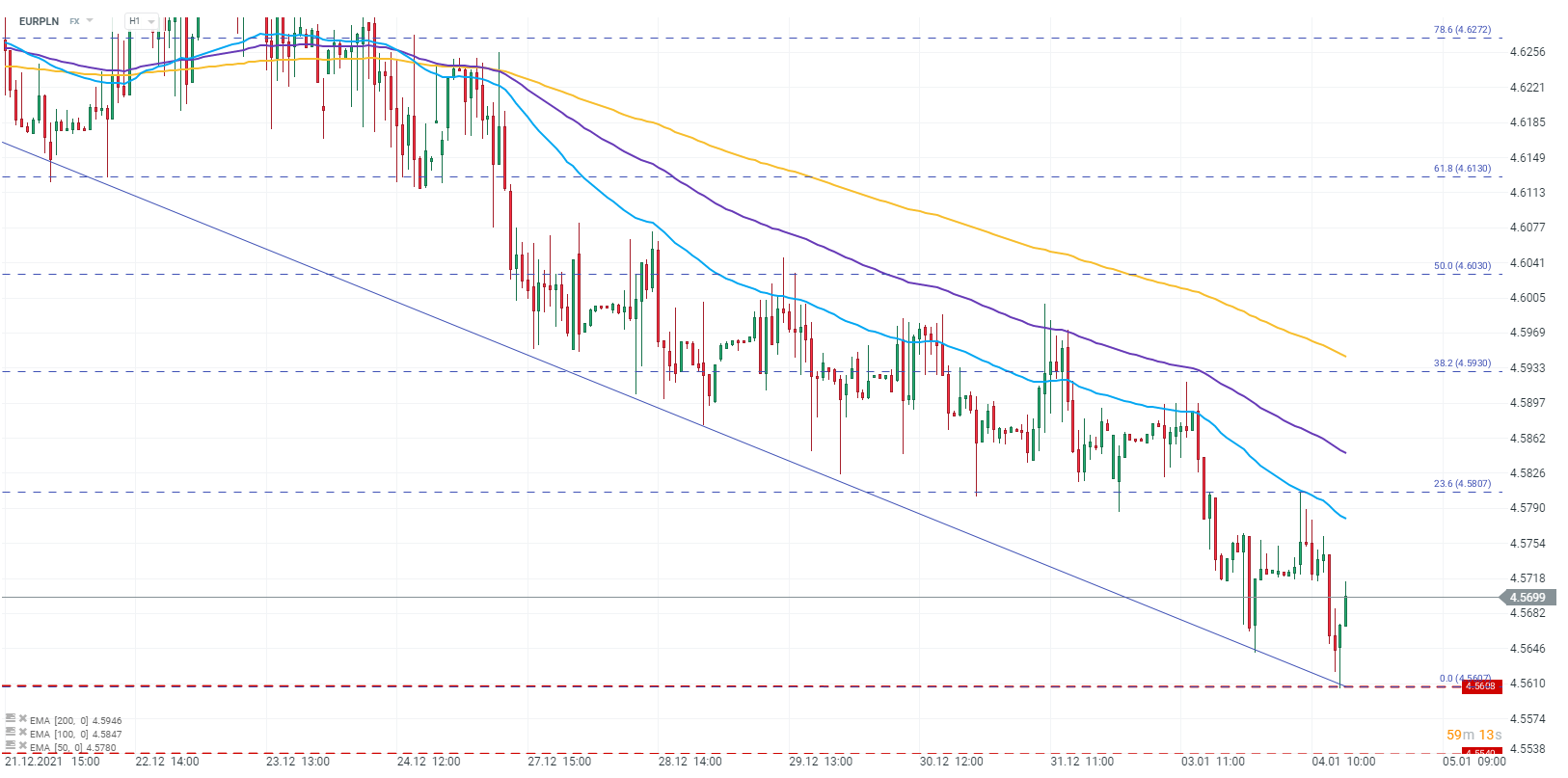 Tuż po decyzji Rady kurs EURPLN umocnił się i zmierza w kierunku oporu wyznaczonego przez zniesienie 23,6% Fibo. Źródło: xStation 5