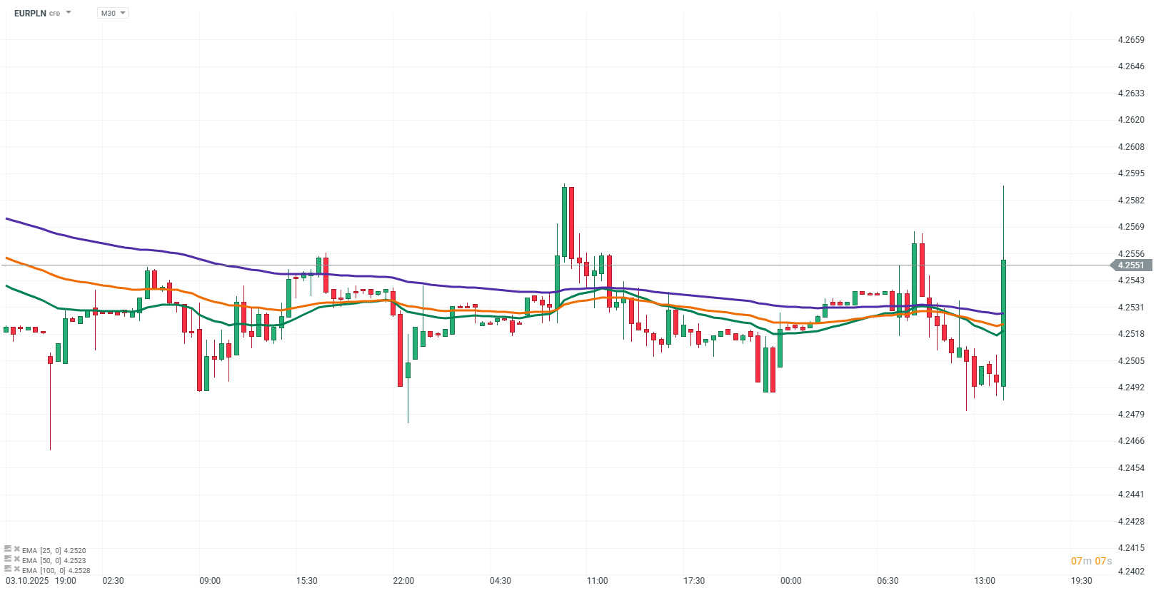 EURPLN rośnie wyraźnie po zaskoczeniu ze strony RPP, choć i tak para pozostaje mało zmienna w ostatnich tygodniach. Poniżej wykres 30 minutowy oraz dzienny.