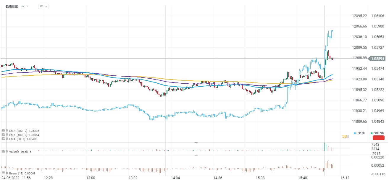 Rynki byczo zareagowały na odczyt dzisiejszych danych, EUR umocniło się względem dolara, indeks US100 zyskał. Źródło: xStation 5
