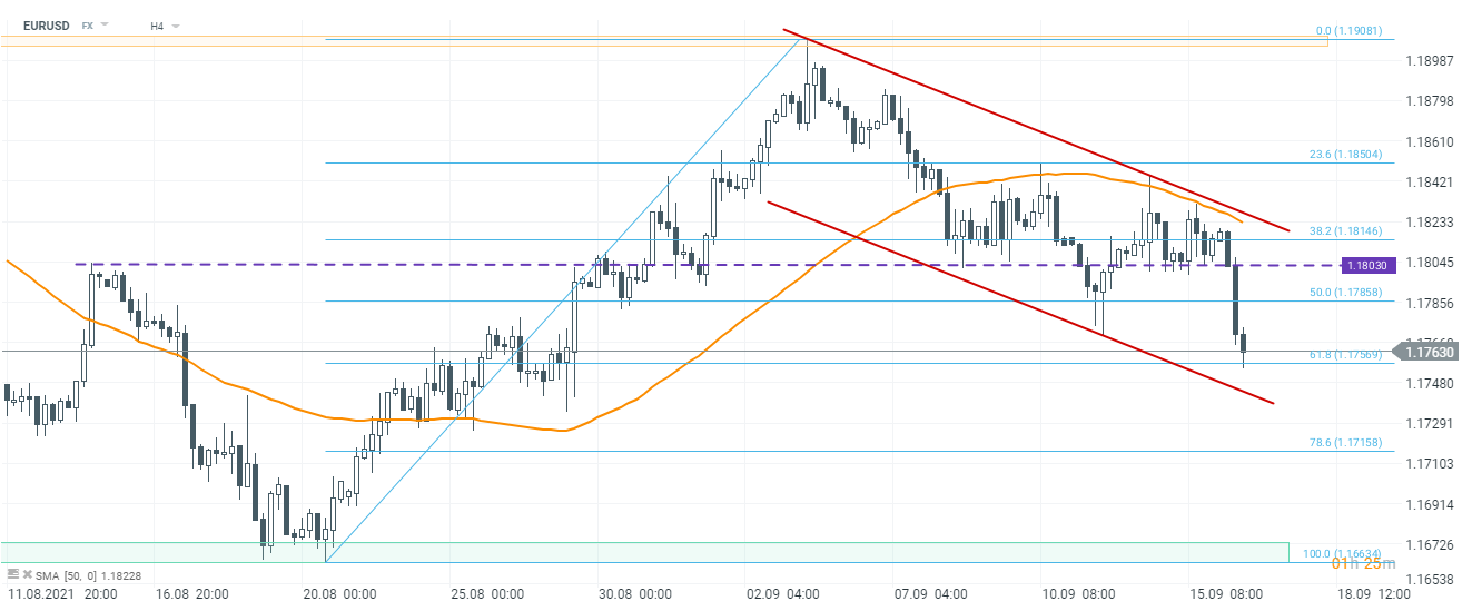 EURUSD lekko wzrósł po odczycie sprzedaży detalicznej z USA - reakcja na EURUSD jest raczej ograniczona, jednak warto pamiętać, że dolar silnie umacniał się już w pierwszej części dnia. Patrząc na interwał H4, kurs głównej pary walutowej sięga poziomów najniższych od końca sierpnia, zbliżając się do zniesienia Fibonacciego 61,8% fali wzrostowej rozpoczętej 20 sierpnia.