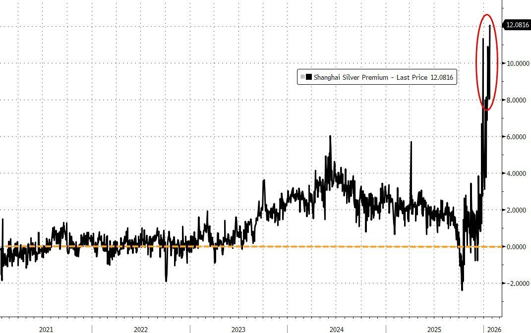 Niedobór srebra widoczny jest przede wszystkim na rynku chińskim. Powyżej wykres premii cenowej srebra dostępnego na giełdzie w Szanghaju vs tego dostępnego na rynkach zachodnich. Źródło: Bloomberg Financial Lp via ZeroHedge