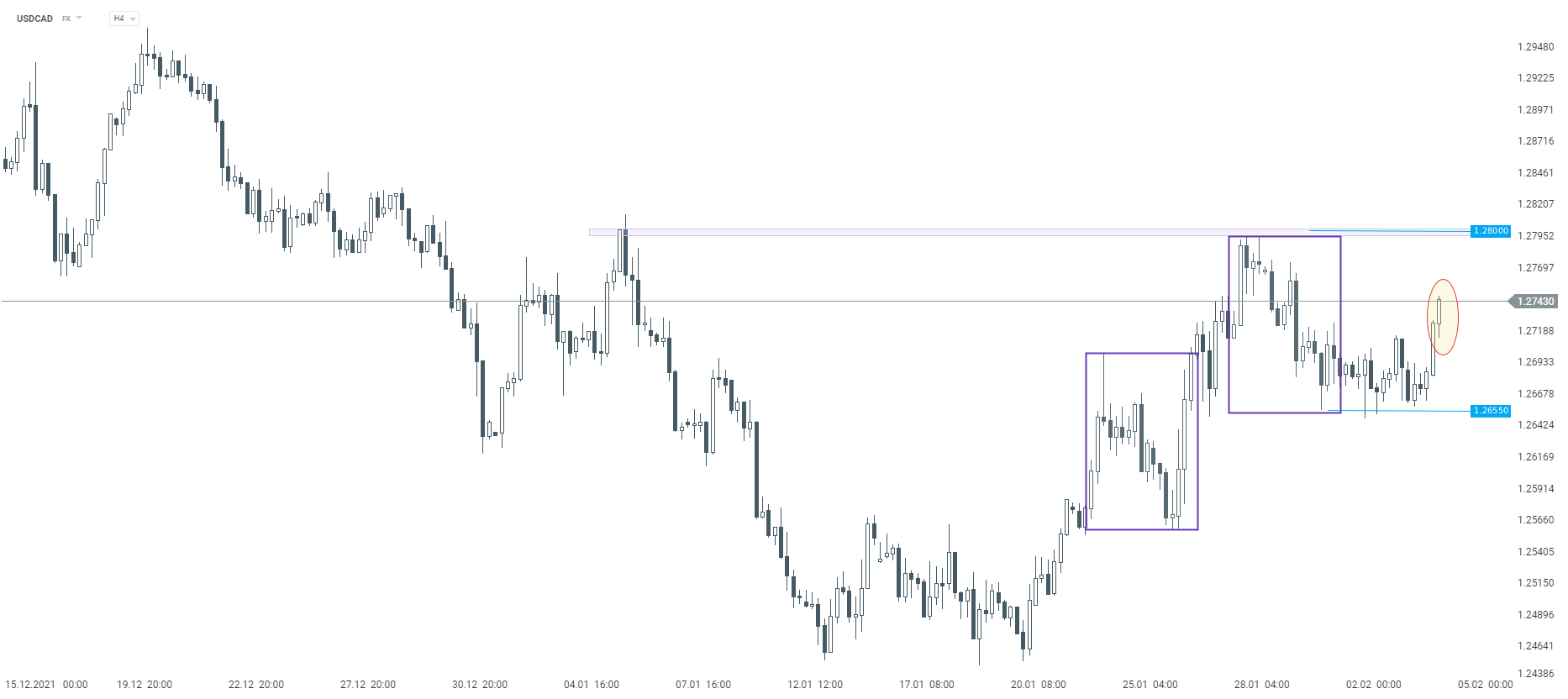 W pierwszej reakcji po danych możemy obserwować ruch w górę na parze walutowej USDCAD. Notowania ruszyły około 20 pipsów w górę tuż po publikacji, co wpisuje się w sytuację techniczną. Kluczowym wsparciem pozostają okolice 1,2655, gdzie znajduje się dolne ograniczenie układu 1:1. Najbliższy opór wypada z kolei przy 1,2800.
