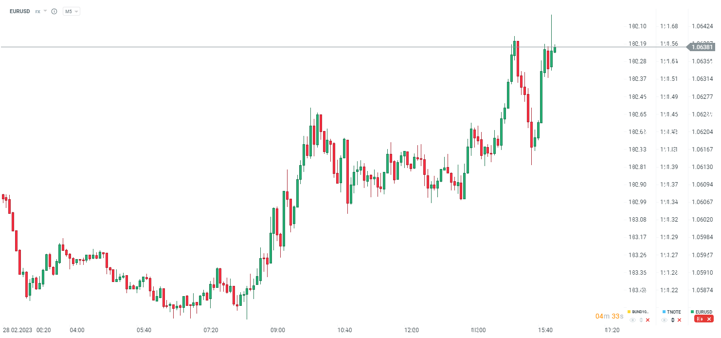 Słabsze dane i niższe oczekiwania inflacyjne mogą dawać nadzieje inwestorom, że Fed nie będzie ekstremalnie jastrzębi w marcu. W odpowiedzi dolar traci i EURUSD wychodzi na dzienne szczyty, najwyższe od 22 lutego.