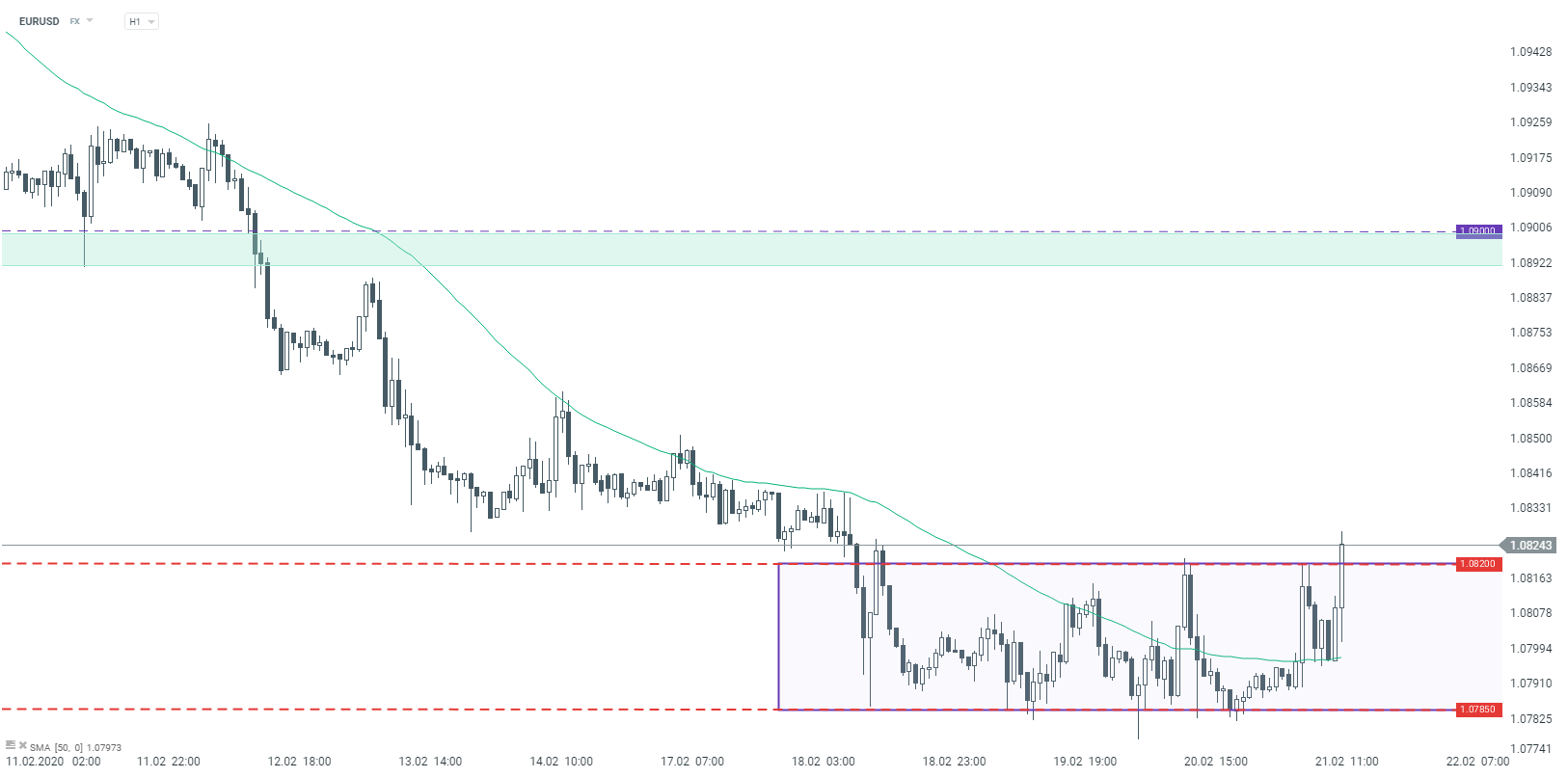 Dzisiejsze odczyty z USA rozczarowują, oba wskaźniki PMI zarówno dla przemyslu, jak i usług wypadły poniżej oczekiwań rynkowych. Szczególnie słabo wygląda sektor usług, gdzie wskaźnik spadł poniżej bariery 50 punktów. W pierwszej reakcji po danych możemy obserwować wzrosty na EURUSD, który w ostatnim czasie poruszał się w zakresie wąskiej konoslidacji. Aktualnie istnieje szasna na wybicie górą.