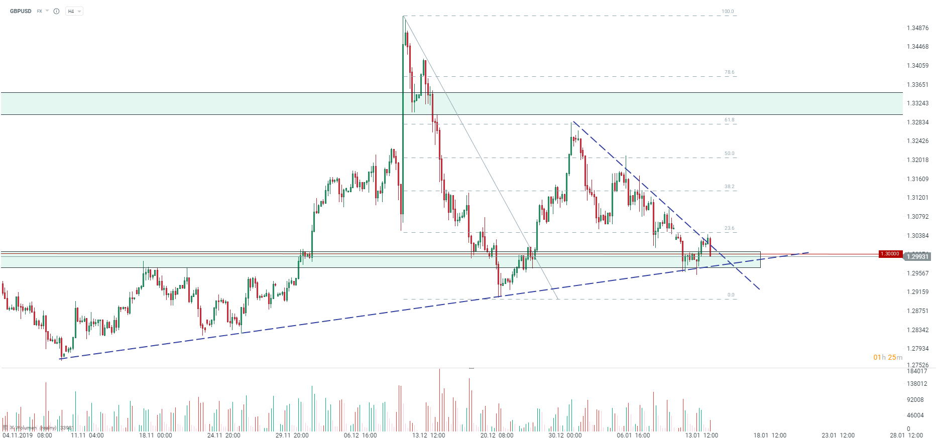 W odpowiedzi funt wyraźnie traci. Cofa się z okolic spadkowej linii trendu oraz para jest już poniżej poziomu 1.300. Obecnie testowana jest ważna strefa popytowa. Niewiele poniżej znajduje się wzrostowa linia trendu, która ostatnio służyła jako bardzo ważne wsparcie. Źródło: xStation5