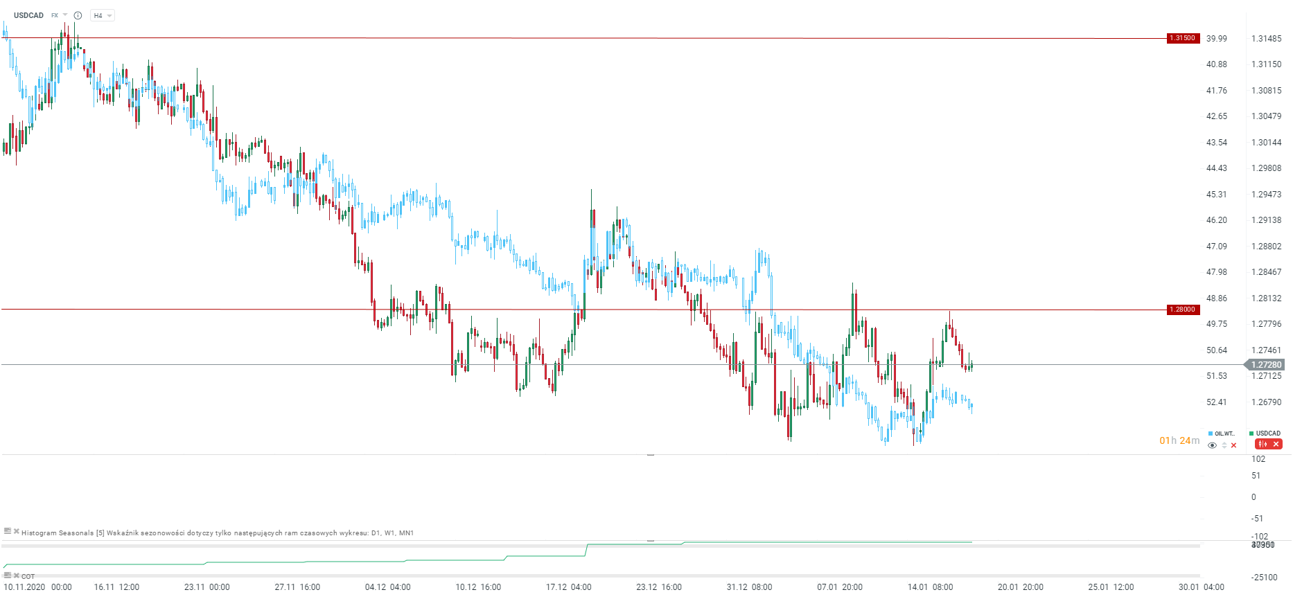Warto zauważyć, że ostatnim razem wskazywaliśmy na silny opór w okolicach poziomu 1,2800, który powinien być utrzymany. Jak widać USDCAD cofa się od tego poziomu i wciąż mocna ropa wskazuje na potencjalne dalsze spadki, przynajmniej poniżej poziomu 1,2700.