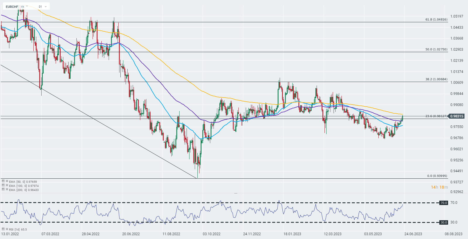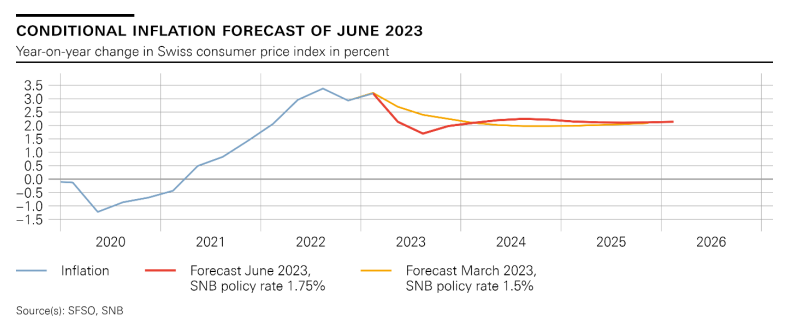 W komunikacie po decyzji SNB zakomunikował, że nie można wykluczyć dalszych podwyżek stóp procentowych w przyszłości. Z drugiej jednak strony Bank zrewidował w dół prognozy inflacyjne w 2023 roku do 2,2% wobec wcześniejszych 2,6%. W 2024 roku inflacja ma utrzymać się na poziomie 2,2%. W średnim terminie presja inflacyjna według SNB ponownie wzrosła. Sam wydźwięk komunikatu jest jednak relatywnie golębi. Wzrost PKB w tym roku ma wynieść około 1%.