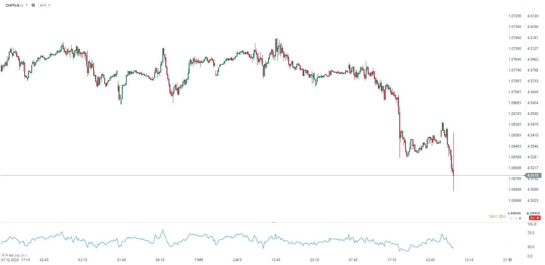 CHFPLN zareagował wzrostem po samej decyzji, ale później doszło do przełamania poziomu 4,52 w dół: