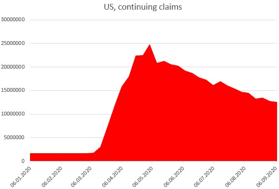 Wnioski o zasiłek spadają nieco wolniej od rynkowych oczekiwań. Co więcej, w przypadku wstępnych wniosków mamy nawet niewielkie odbicie, gdyż odczyt wyniósł 870 tys. przy poprzednim 866 tys. (rewizja z 860 tys.), podczas gdy oczekiwano 840 tys. Mniejszy spadek niż oczekiwano jest widoczny we wnioskach kontynuacyjnych. W tym wypadku wnioski trzymają się twardo powyżej 12 mln, a konkretnie na poziomie 12,580 mln przy oczekiwaniu 12,300 mln oraz przy poprzednim poziomie 12,747 mln.