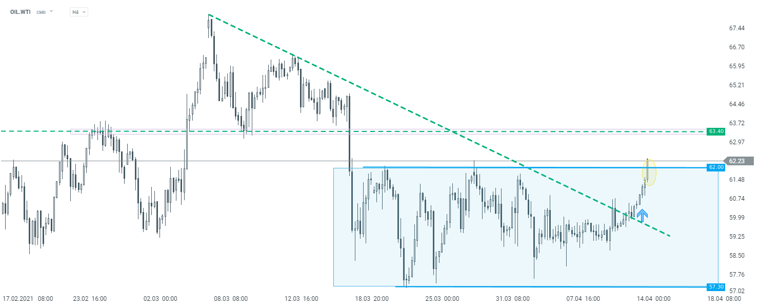 Tuż po publikacji obserwujemy wzrosty na rynku ropy naftowej. Patrząc technicznie na OIL.WTI, testowane jest właśnie górne ograniczenie konsolidacji. Jeżeli kupujący zdołają sforsować poziom 62$, niewykluczone jest przedłużenie wzrostów w kierunku kolejnego oporu, który znajduje się przy 63,4$.