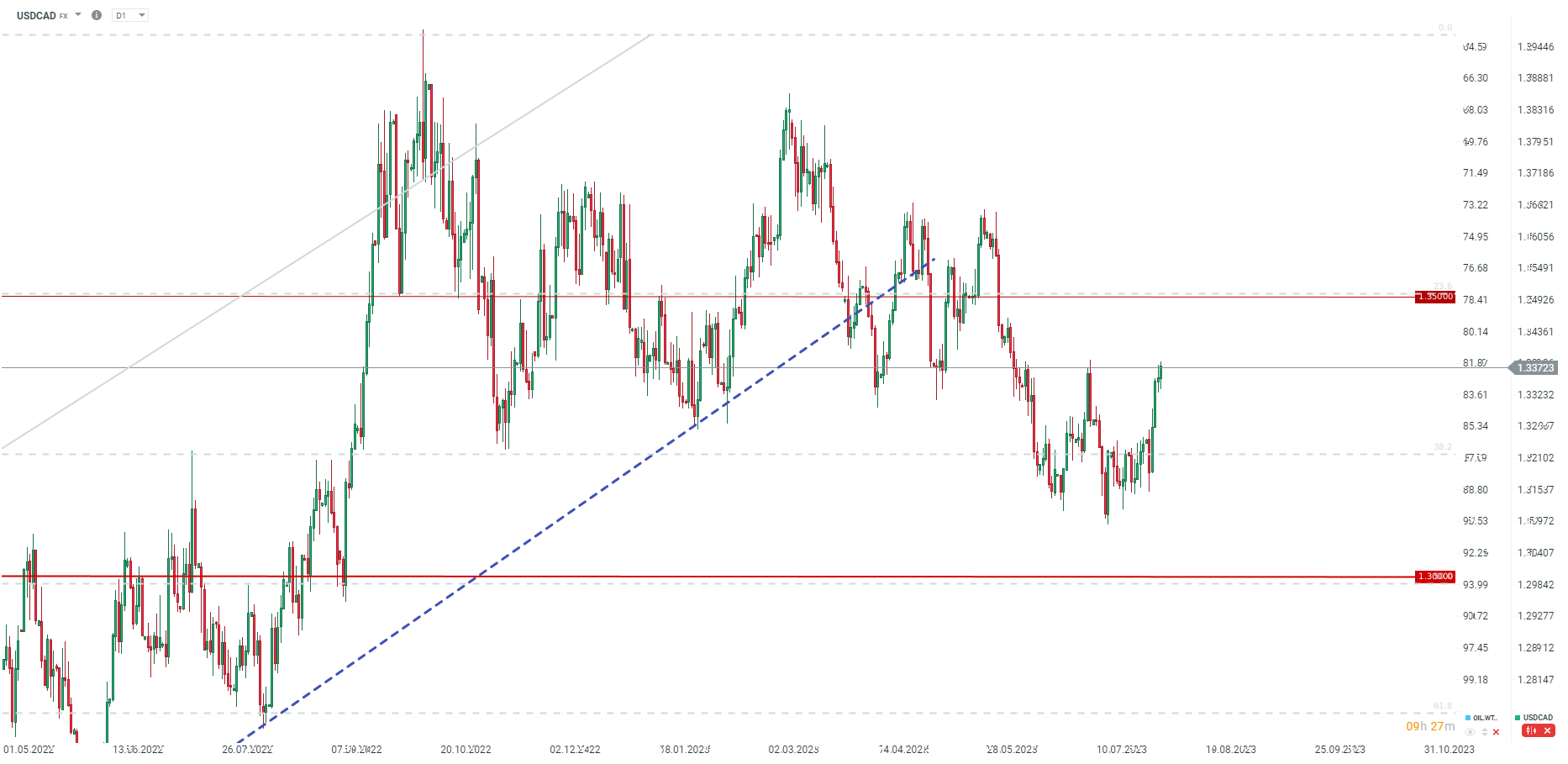 Dane słabe, ale spadek wynika przede wszystkim ze spadku zatrudnienia na niepełny etat. Po ostatnim ogromnym wzroście zatrudnienia na pełny etat, za lipiec mamy wzrost na pełny etat zaledwie o 1,7 tys. USDCAD nie rusza się zbyt mocno w górę, co jest związane z mieszanymi danymi z USA, które pokazały wysokie płace, spadek stopy bezrobocia, ale nieco niższe NFP.