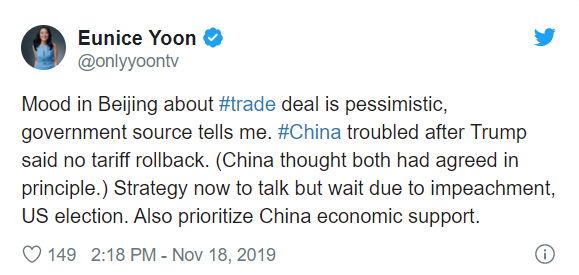 Na portalu twitter chińska dziennikarka (Eunice Yoon) z CNBC napisała, że wg doniesień rządowych nastroje przed najbliższym spotkaniem XI- Trump są pesymistyczne. Chiny są zaniepokojone ostatnim stwierdzeniem Trumpa co do braku wycofania się z opłat celnych. Aktualnie Pekin co prawda chce rozmawiać z USA, jednak wstrzyma się z decyzjami z powodu procedury impeachmentu.
