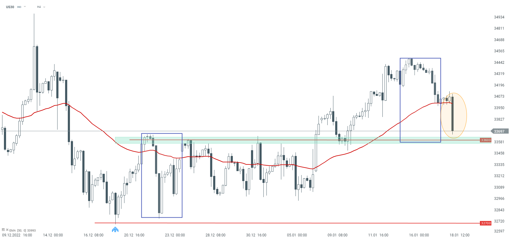 US30 przymierza się do testu ważnej strefy podażowej przy poziomie 33600 punktów. Poziom ten jest wyznaczony przez lokalne szczyty z końca grudnia oraz zakres poprzedniej dużej fali spadkowej. Źródło: xStation5