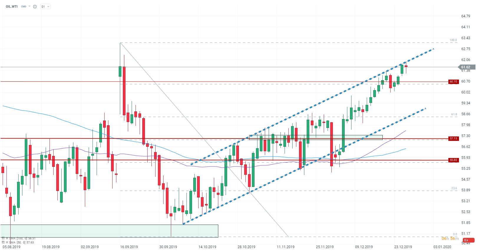 Zapasy ropy wg DOE spadają o 5,5 mln brk na dzień, przy oczekiwaniu spadku na poziomie -1,7 mln brk oraz przy poprzednim spadku na poziomie 1,08 mln brk. Spadają zapasy destylatów, ale z drugiej strony zapasy benzyny rosną o niemal 2 mln brk, przy wysokim oczekiwaniu 1,7 mln brk. Znacząco wzrasta moc wykorzystania rafinerii. Ceny ropy naftowej początkowo wyraźnie odbiły, jednak pozostają na lekkim dziennym spadku.