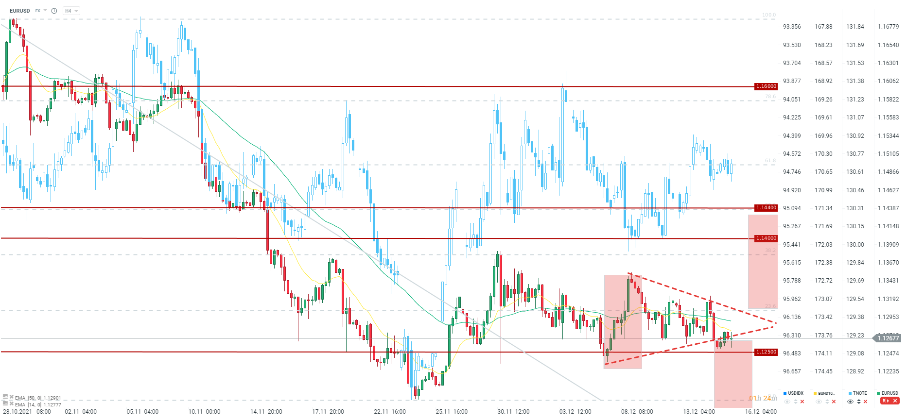 Dolar reaguje nieco negatywnie na te doniesienia, ale i tak EURUSD pozostaje nisko, poniżej kluczowego oporu w postaci dolnego ograniczenia formacji trójkąta. Mimo to para znajduje się powyżej kluczowego wsparcia jakim jest poziom 1,1250.