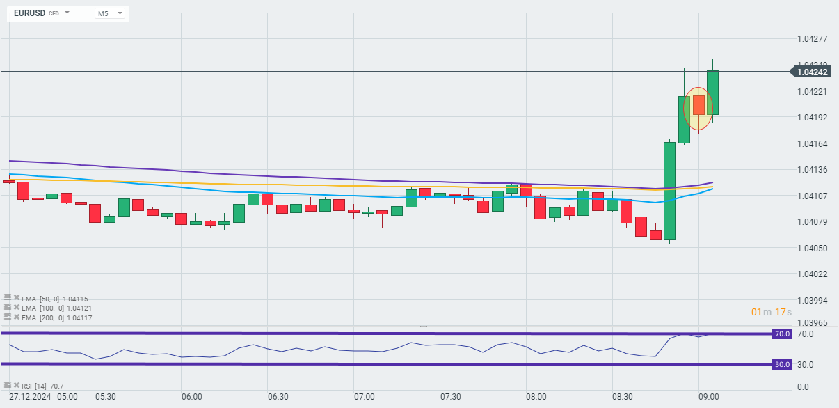 Tak słabe dane w Hiszpanii, jednym z kluczowych krajów Unii Europejskiej może zachęcać EBC do szybszych obniżek stóp procentowych. Mimo tego, że euro na publikację danych faktycznie zareagowało spadkami, to ruch ten został szybko odwrócony, a na parze EURUSD obserwujemy wyraźne odbicie.