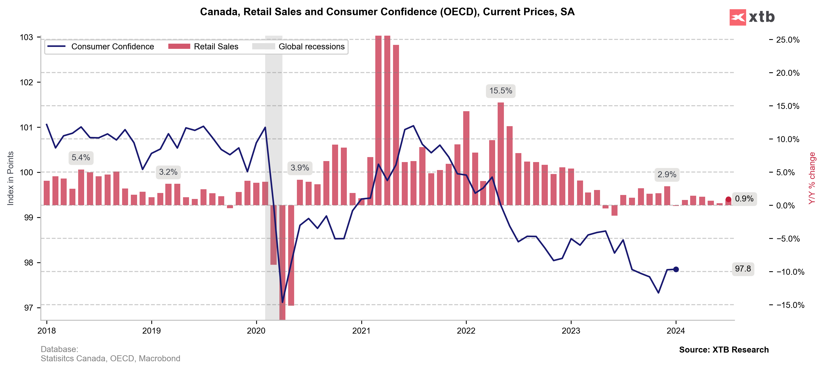 Sprzedaż detaliczna w Kanadzie w ujęciu m/m w lipcu wzrosła wyżej niż oczekiwano. Istotnym motorem napędowym wzrostu była sprzedaż pojazdów, która w ujęciu m/m wzrosła o 2,2%, z czego sprzedaż nowych samochodów była wyższa o 2,3%, używanych samochodów spadła o 0,8%, natomiast w przypadku pozostałych pojazdów wzrosła o 5,6%, co jest najwyższym wzrostem wśród wszystkich segmentów. Mocniejszą odbudowę widać też w segmencie e-commerce, gdzie wzrost w ujęciu m/m wyniósł 3,4%.