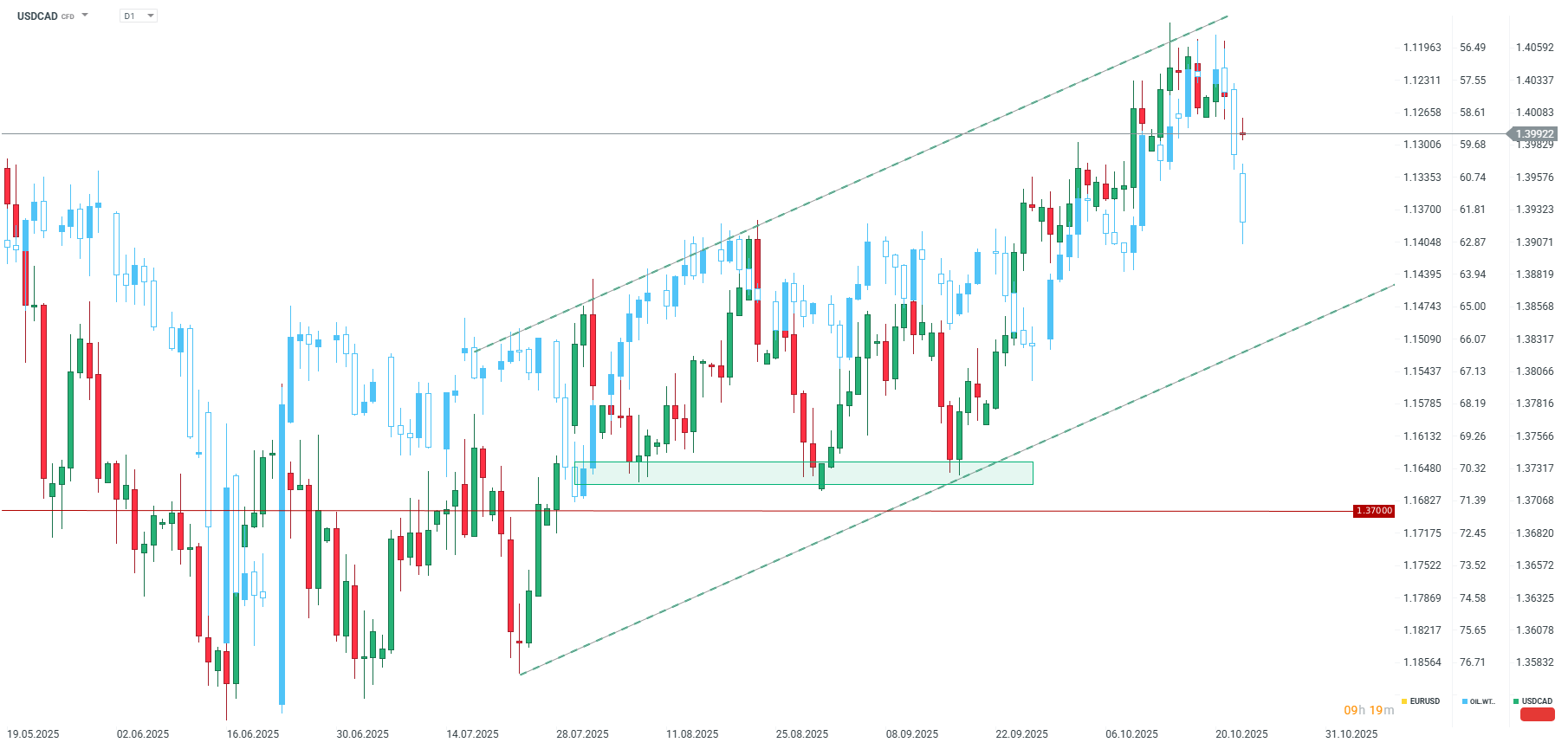 Obecny raport za sierpień pokazuje relatywnie mocny odbudowujący się popyt konsumencki po wcześniejszych spadkach, co raczej nie wspiera natychmiastowych obniżek stóp procentowych przez BoC. Z drugiej strony, szybki wskaźnik na wrzesień sugeruje potencjalne ponowne osłabienie sprzedaży – jeśli trend ten się potwierdzi, presja na obniżki stóp może wzrosnąć. Kluczowe będą zrewidowane dane za wrzesień i kolejne miesiące do oceny nastawienia BoC wobec cięcia stóp procentowych. Warto wspomnieć, że inflacja w Kanadzie odbiła aż do 2,4% r/r za wrzesień, przy poziomie 1,9% r/r za sierpień. Prawdopodobieństwo kolejnej obniżki w Kanadzie (decyzja w ten sam dzień co Fed) to aż 80%. USDCAD pozostaje poniżej poziomu 1,40 i zniżkuje minimalnie po raporcie. Warto zwrócić uwagę na umocnienie ropy, która sugeruje, że USDCAD może zaliczyć korektę w kierunku poziomu 1,3900-1,3950.
