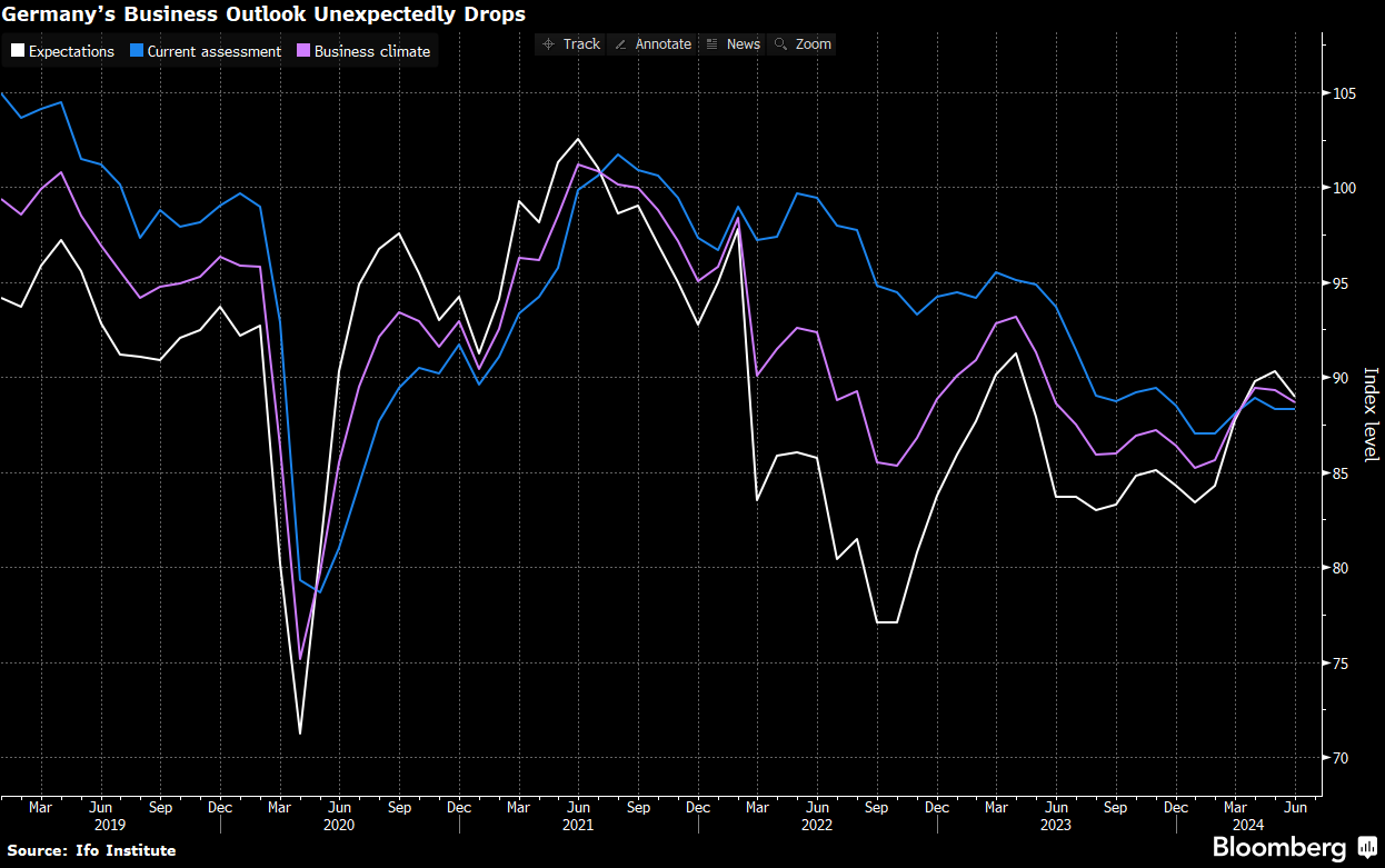 Perspektywy biznesowe w Niemczech spadły po raz pierwszy od pięciu miesięcy. Źródło: Bloomberg Financial LP