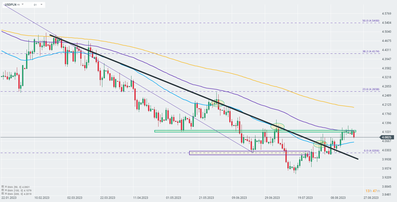 Para USDPLN wyłamuje się dołem z trwającej konsolidacji blisko strefy 4,1 i obecnie notowana jest blisko poziomu 4,0830.