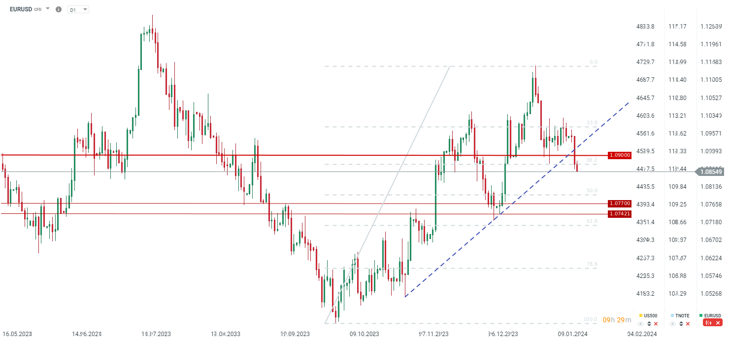 Dolar umacnia się po danych. EURUSD testuje okolice 1,0850. Spadają szanse na obniżkę stóp procentowych w USA już w marcu.
