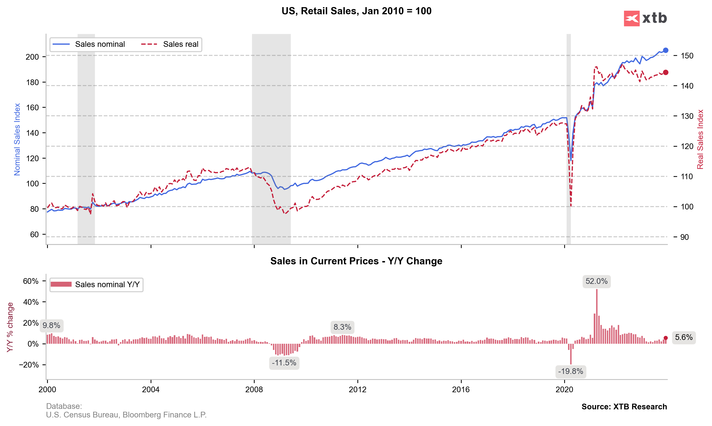 Wzrost w ujęciu rocznym sięga 5,6% r/r. To najwyższa dynamika od lutego. Źródło: Bloomberg Finance LP, XTB