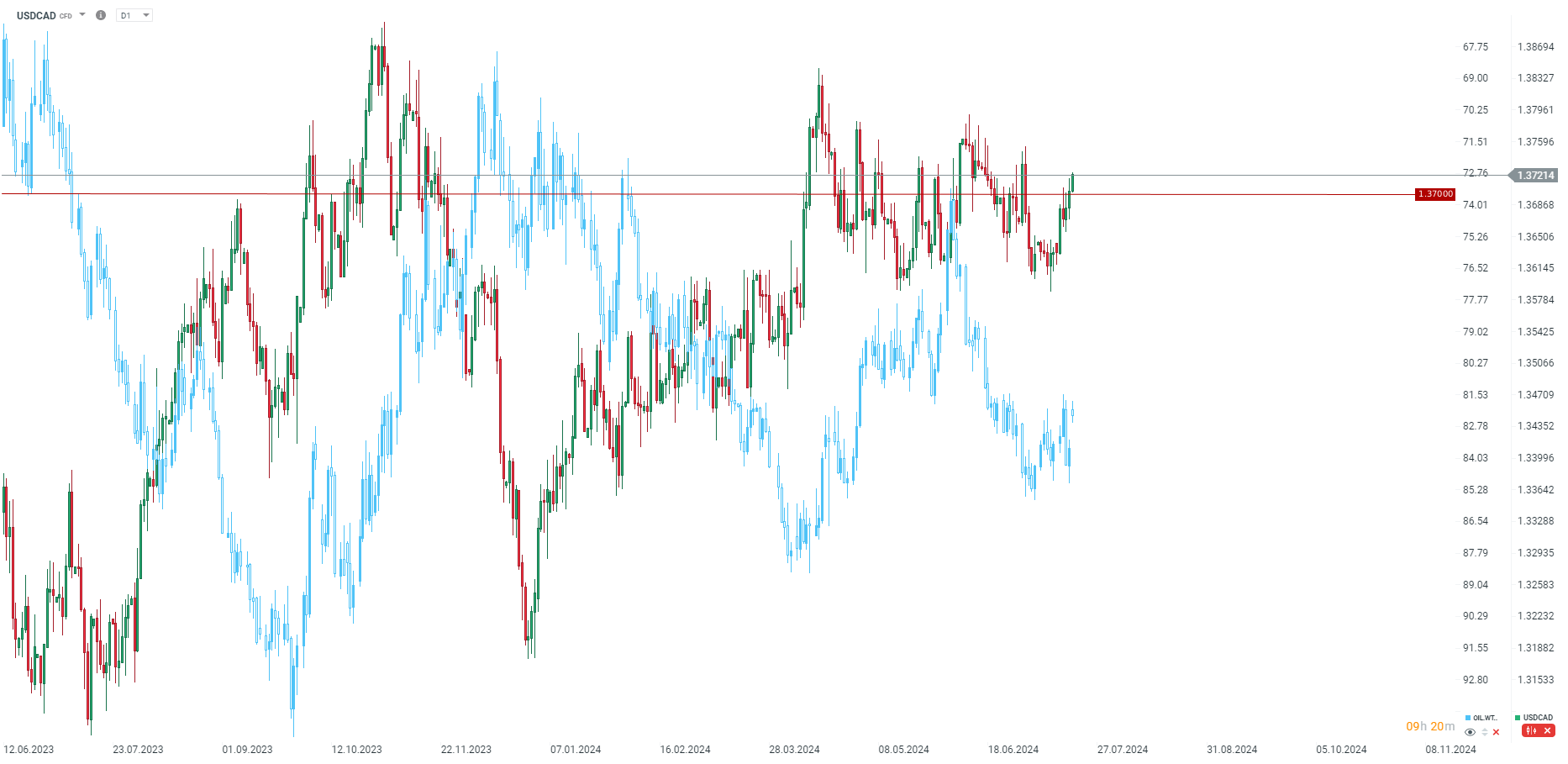 Raport o sprzedaży detalicznej wypadł słabo. Największe spadki były widoczne w sektorze spożywczym, budowlanym. Warto pamiętać, że w przyszłym tygodniu mamy decyzję BoC, choć rynek nie oczekuje żadnego ruchu. Niemal pełna obniżka jest wyceniana na wrzesień. Jak widać, dane z Kanady nie pokazują się od dobrej strony, co może zwiększyć potencjalną presję na CAD. Jednocześnie jednak obserwujemy mocną ropę naftową, która jednak nie wspiera dolara kanadyjskiego od kilku sesji, co zwiększyło dywergencję między USDCAD oraz ropą WTI. USDCAD notowany jest najwyżej od 2 lipca, zaliczając niemal 100 pipsów odbicia w tym tygodniu.