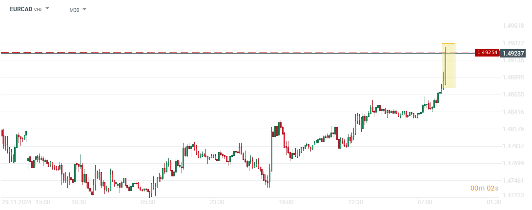 W reakcji na dane z rynku pracy para EURCAD notuje mocny 0,3% ruch wzrostowy i próbuje obecnie przebić lokalny szczyt wyznaczony na poziomie