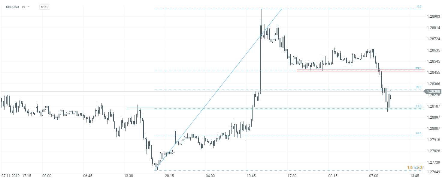 Kurs funta do dolara nie wykazuje większej rekacji na dane z godziny 10:30. Aktualnie wsparciem pozostaje strefa przy współczynniku 61,8% Fibonacciego, a opór znajduje się przy zniesieniu 38,2%. GBPUSD interwał M15. Źródło: xStation