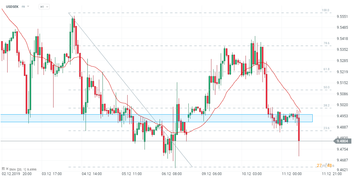 W rekacji na powyższe dane, SEK umocnia się w stosunko do dolara, przełamując 23,6% zniesienie Fibo. Źródło: xStation5