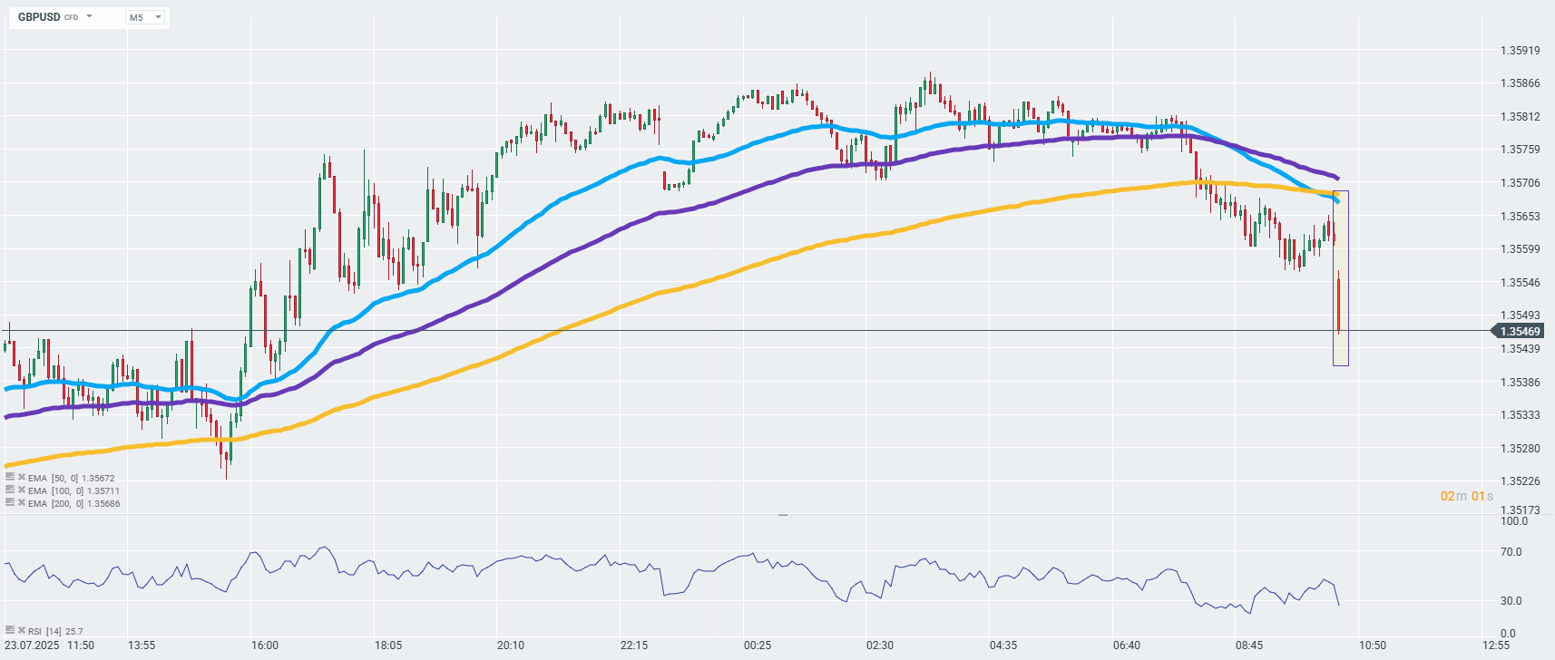 Para walutowa GBPUSD odnotowała pokaźne tąpniecie po tym jak dane PMI dla Wielkiej Brytanii pokazały silny spadek sentymentów sektora usługowego. Niższe dane mogą przyspieszyć ewentualne decyzje BoE w sprawie cięć stóp procentowych.