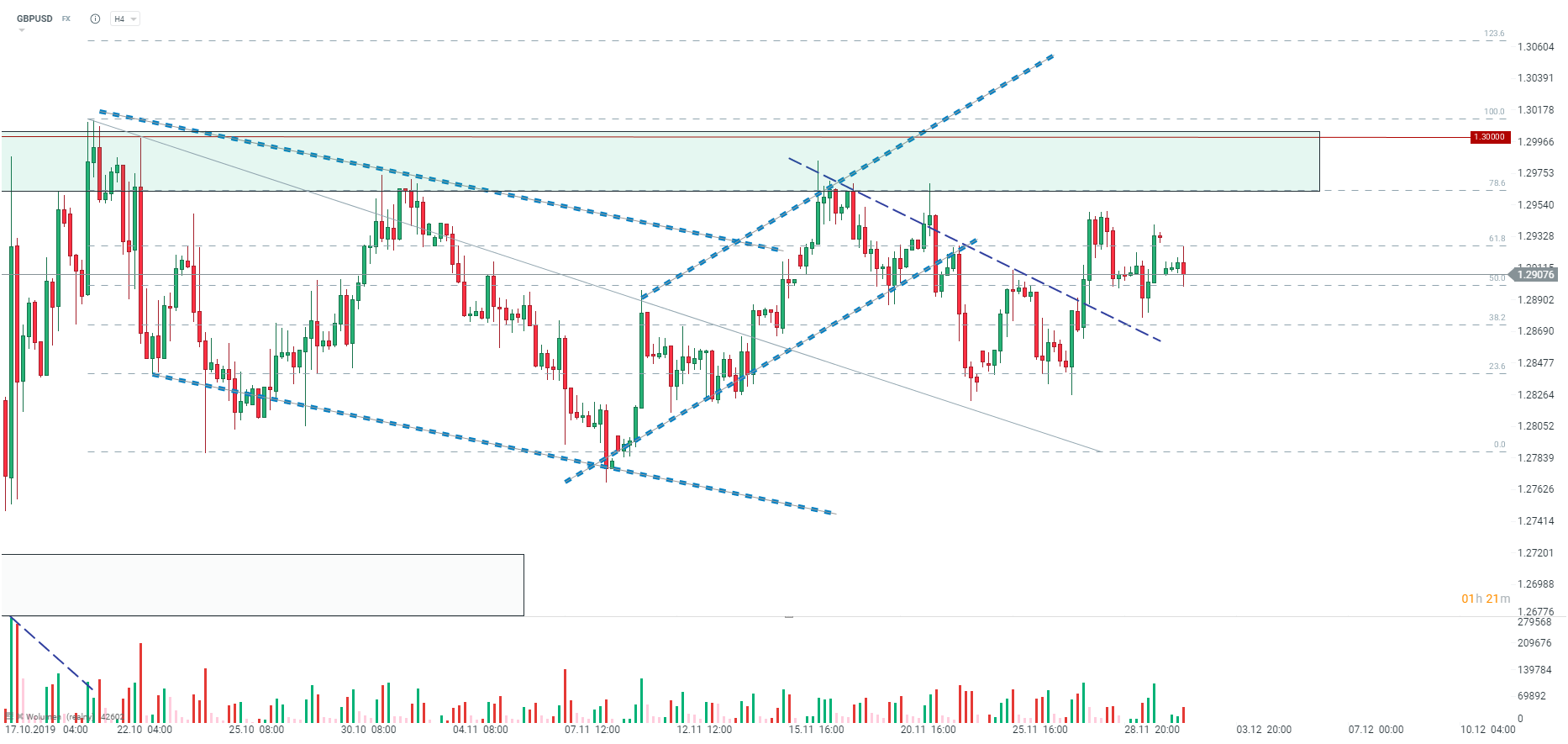 Tymczasem GBPUSD pozostaje wewnątrz wąskiej konsolidacji w której znajduje się od połowy października. Obecnie kluczowe wsparcie to okolice znziesienia 23.6, natomiast opór to 78.6. Źródło: xStation5