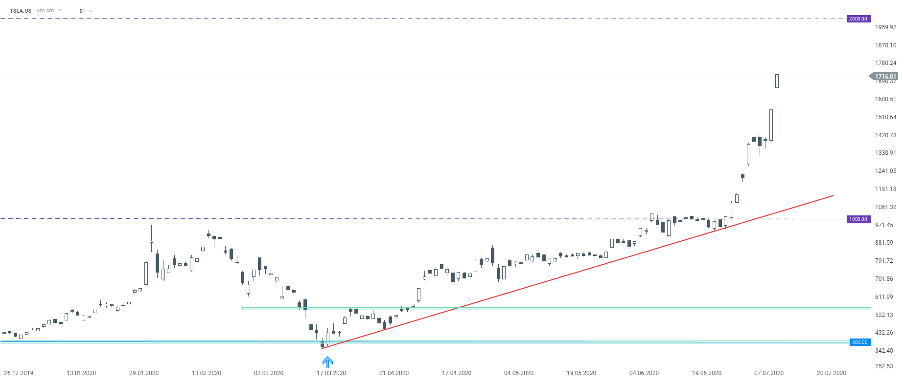 Sesja w USA rozpoczyna się na solidnym plusie, indeks technologiczny Nasdaq znajduje się ponad 1% na plusie, a Tesla (TSLA.US) wchodząca w jego skład notuje aż +12%. Za jedną akcję spółki Elona Muska trzeba już płacić powyżej $1730. W zeszłym tygodniu producent samochodów elektrycznych podał zaskakująco mocne dane wskazujące na 90 650 dostaw pojazdów w II kw. - liczby okazały się lepsze niż przewidywania analityków. Oprócz tego, inwestorzy zapewne pozytywnie przyjęli informację o potencjalnym przyjęciu Tesli do indeksu S&P 500. Warunkiem pozostaje osiągnięcie zysku netto w ciągu czterech kolejnych kwartałach - może się to udać już za sprawą najbliższej publikacji wyników (22 lipca). Nie ulega wątpliwości, że byłby to dla przedsiębiorstwa kamień milowy. Dołączając do S&P 500, Tesla znalazłaby się dzisiaj na dziesiątym miejscu w “TOP10” największych amerykańskich spółek pod względem wartości rynkowej - jej kapitalizacja podczas dzisiejszej sesji blisko 330 mld USD.