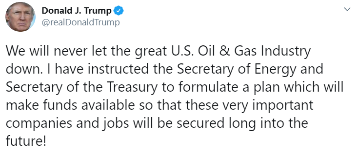 W obliczu załamania na rynku ropy naftowej, nie musieliśmy długo czekać na reakcję prezydenta USA. Donald Trump na swoim Twitterze zapewnia, że nigdy nie pozwoli upaść przemysłowi naftowemu, a także że poinstruował odpowiednich ministrów do przygotowania planu pomocowego dla spółek znajdujących się w tarapatach w związku z niską ceną ropy naftowej. W pierwszej reakcji po “tweecie” możemy obserwować wyhamowanie spadków na rynku akcji, niemniej indeksy w USA i tak znjadują się około 1,5% pod kreską.