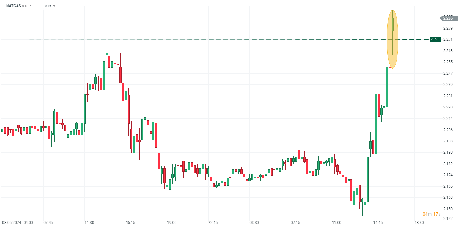 W reakcji na dane kontrakt na gaz wybija nowe dzisiejsze szczyty, przebijając poziom 2.271. Źródło: xStation