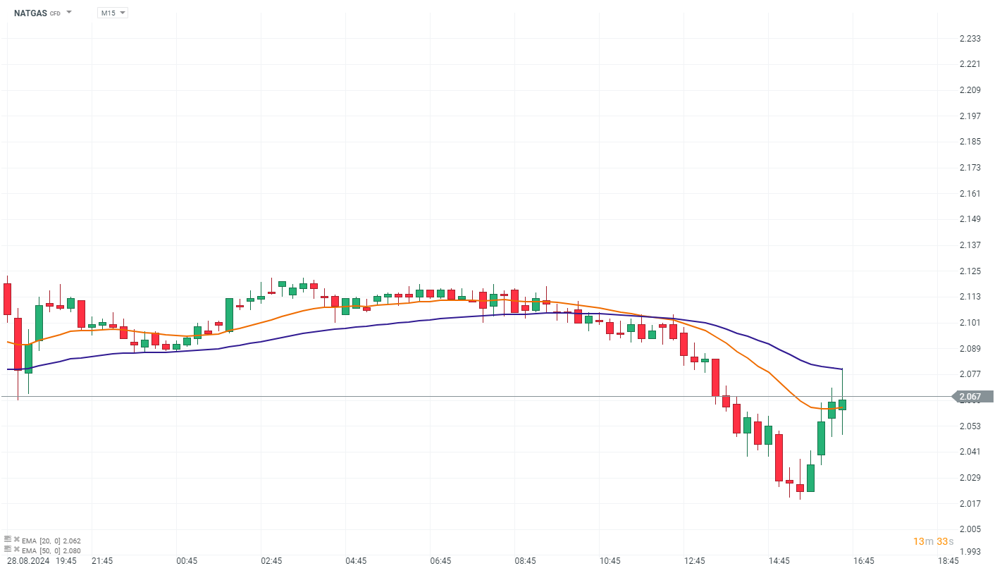 W natychmiastowej rekacji na dane cena na kontraktach na gaz rośnie, przekraczając 20-okresową EMA. Źródło: xStation5