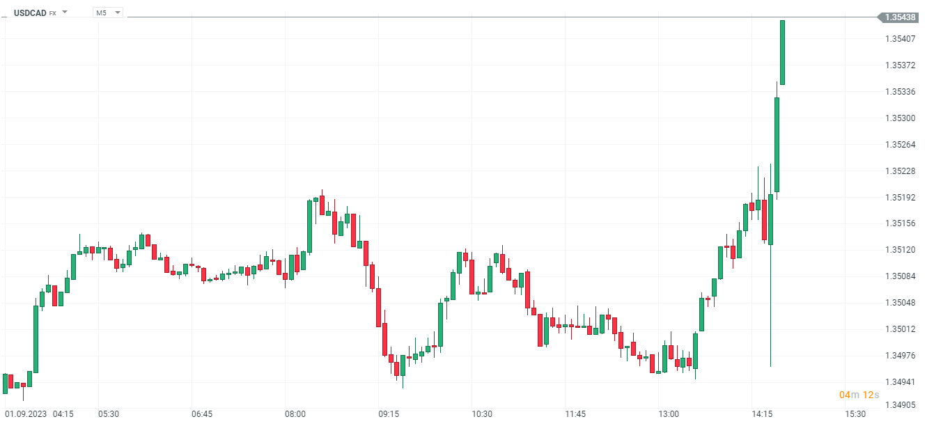 Kanadyjski dolar w pierwszej reakcji osłabia się względem USD po słabszym odczucie krajowego PKB oraz mocnego raportu NFP (na którym jednak bez wątpienia jest 0,3% wzrost bezrobocia, który zaskoczył analityków oczekujących niezmiennie odczytu 3,5%).
