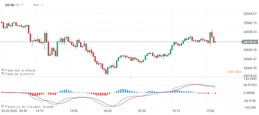 Zmienność w kontraktach na Nasdaq 100 utrzymuje się, od 15:45 US100 stracił blisko 200 punktów ale wciąż rośnie dziś ponad 1,5%. Ponad 5% zwyżkują dziś akcje Nvidia, ponad 8% traci Amazon, a Alphabet cofa się blisko 3% - walory pozostałych firm sporo zyskują - odbija branża oprogramowania.