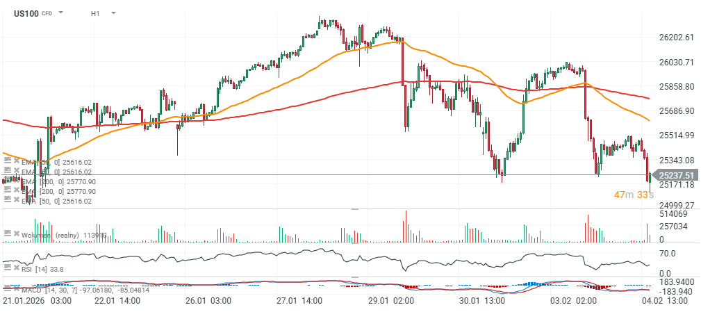 Choć po danych ISM indeks nieznacznie wzrósł, widzimy, że wciąż dominuje strona sprzedażowa. Poza walorami BigTech (gdzie tracą m.in. Meta Platforms, czy Nvidia) spadają dziś akcje AMD (blisko -14%), Palantir a sektor technologiczny (zwłaszcza branża oprogramowania) pogłębia wczorajszą wyprzedaż. Przeważa wolumen sprzedażowy, a wskaźnik RSI na godziownym interwale osunął się do okolic wyprzedania. Korekta względem szczytu wynosi ok. 1000 punktów. Raport ISM nie wydaje się pozytywny dla rynku akcji i nadal może sugerować bankierom, że ryzyko inflacyjne pozostaje żywe, podczas gdy 'koszt' utrzymywania jastrzębiej polityki może uderzyć w rynek pracy i koniunkturę wysyłającej sporo mieszanych sygnałów gospodarki USA.